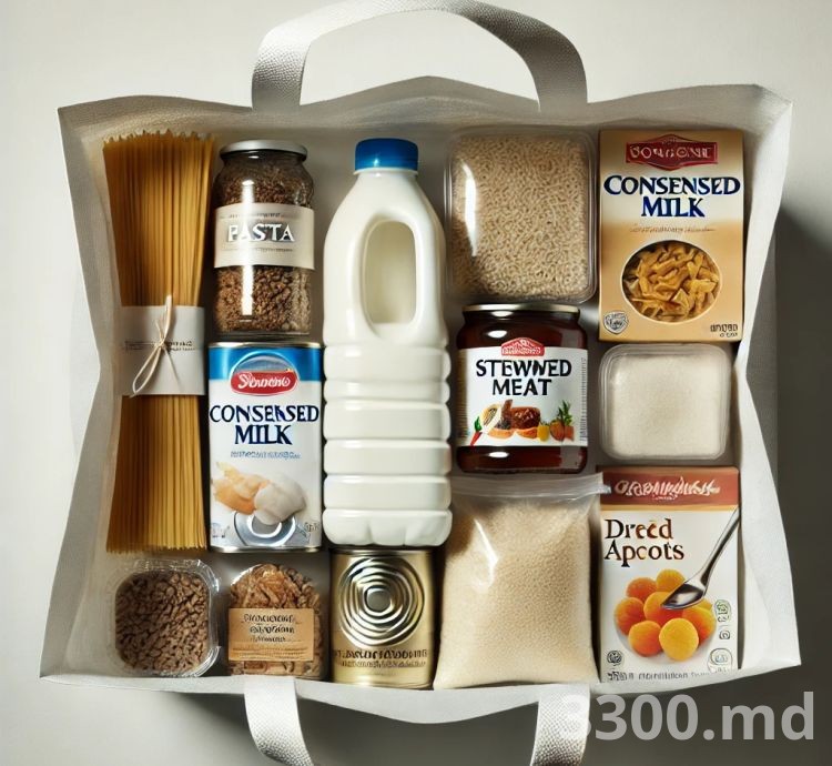 Продуктовый набор упакован в белый полиэтиленовый пакет.